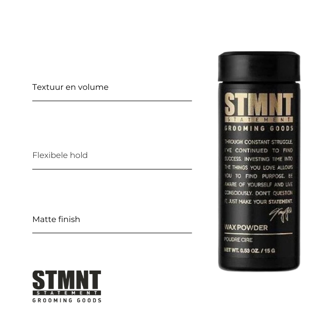 Met de STMNT Wax Powder transformeer jij slap haar tot een volumineus statement kapsel met grip. De poederformule transformeert tot een wax tijdens het aanbrengen, zo profiteer je van de voordelen van zowel een poeder als een wax. Dankzij de medium hold zit je haar de hele dag in model met een semi-matte finish.
