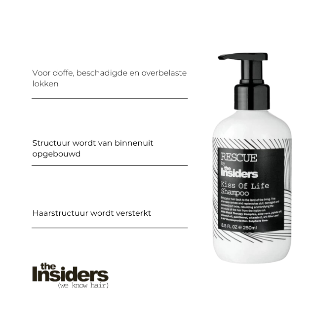 The Insiders Rescue Kiss Of Life Shampoo is een herstellende shampoo die je haar weer tot leven brengt. Heb je dof of beschadigd haar? Dan is dit de perfecte shampoo voor jou! Het brengt doffe, beschadigde en overbelaste lokken weer tot leven. Daarnaast versterkt de verzorgende shampoo de haarstructuur van binnenuit. Fantastisch!
