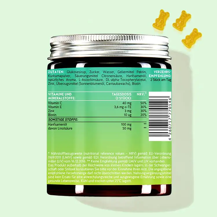 Glucosestroop, suiker, geleermiddel (pectinen), kurkumapoeder, zuurteregelaar (citroenzuur), hennepzaadolie (Cannabis Sativa L.), natuurlijk aroma, L-ascorbinezuur, DL-alfa-tocoferylacetaat, zinkoxide, zonnebloemolie, glansmiddel (Carnaubawas), D-biotine.