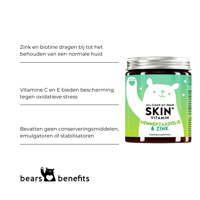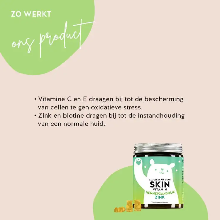 Onze All Clear My Dear Skin Vitamins zijn een sterk geconcentreerd schoonheidsvitamines in de vorm van gummibeertjes met 100 mg hennepolie (inclusief 50 mg linolzuur) per portie en vitamine E en vitamine C. Hennepolie heeft een optimaal vetzuurprofiel met waardevolle omega-3- en omega-6-vetzuren, gamma-linoleenzuur en vele waardevolle mineralen. De gummibeertjes bevatten geen conserveringsmiddelen, emulgatoren of stabilisatoren.