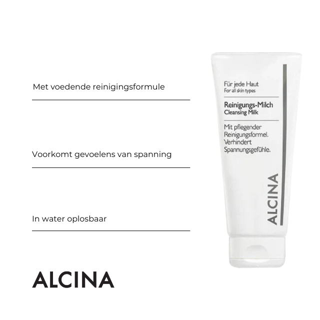 Reinigende verzorging voor de droge gezichtshuid. De in water oplosbare Alcina Reinigingsmelk met waardevolle druivenpitolie reinigt de huid met haar bijzonder milde emulsieformule en voorkomt zo uitdroging en een gespannen gevoel. Verzorgt al tijdens zachte gezichtsreiniging en make-up verwijdering. De romige formule van de reinigingslotion voorkomt huidirritaties die vaak optreden na het reinigen bij een gevoelige en droge huid.