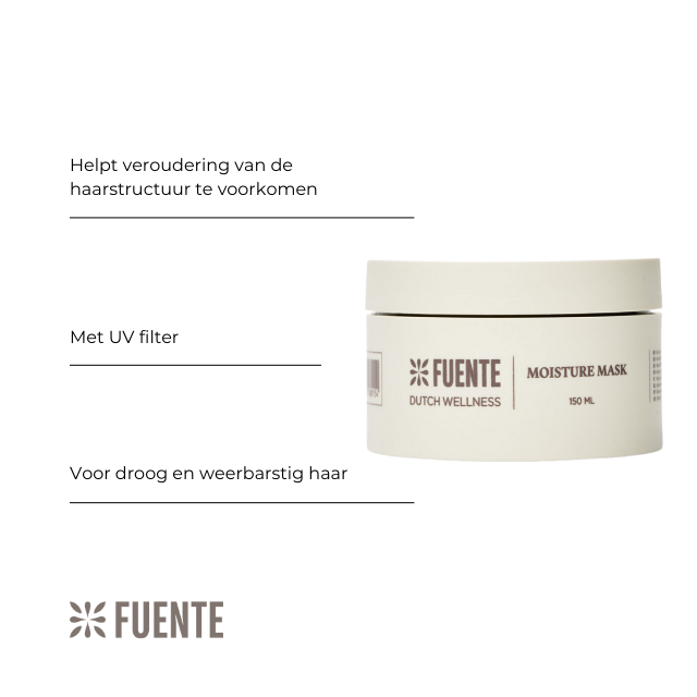 Moisture Mask is speciaal voor droog en weerbarstig haar. Dit vocht inbrengende masker zorgt voor meer veerkracht en souplesse en bevat een uv-filter voor optimale bescherming en is eenvoudig toe te passen met direct resultaat. Dit masker helpt veroudering van de haarstructuur te voorkomen en bevat een UV-filter dat zorgt voor optimale bescherming. Voor optimaal resultaat gebruik je ook de andere producten uit de Fuente Moisture lijn.