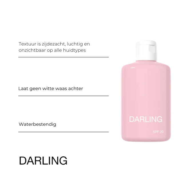 Voor zonblootstelling breng je een ruime hoeveelheid Darling SPF 20 aan op gezicht en lichaam. Deze beschermt de huid tegen UVA- en UVB-straling en zorgt voor hydratatie en anti-aging effecten. - Regelmatig opnieuw aanbrengen voor bescherming