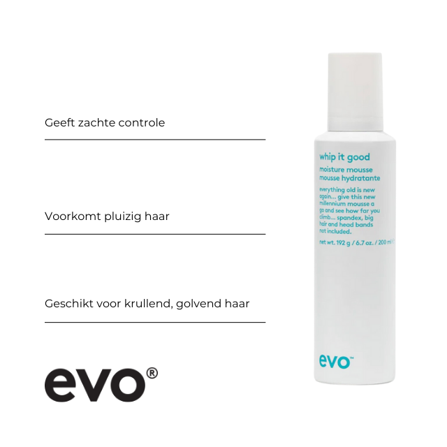 Breng de Evo Whip it Good Styling mousse geleidelijk aan op handdoekdroog- of droog haar. Vervolgens kan het haar op de gewenste manier in model worden gebracht.