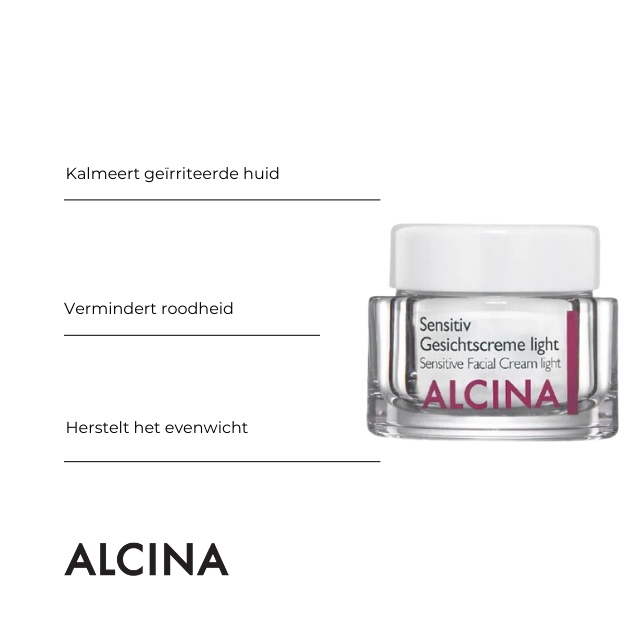 De Alcina Sensitive Gezichtscreme light kalmeert de geirriteerde huid. Vermindert de roodheid. Deze sensitve gezichtscreme ´Light´met haverextract en panthenol kalmeert de geirrtieerde huid en herstelt het evenwicht. Roodheid wordt minder zichtbaar.